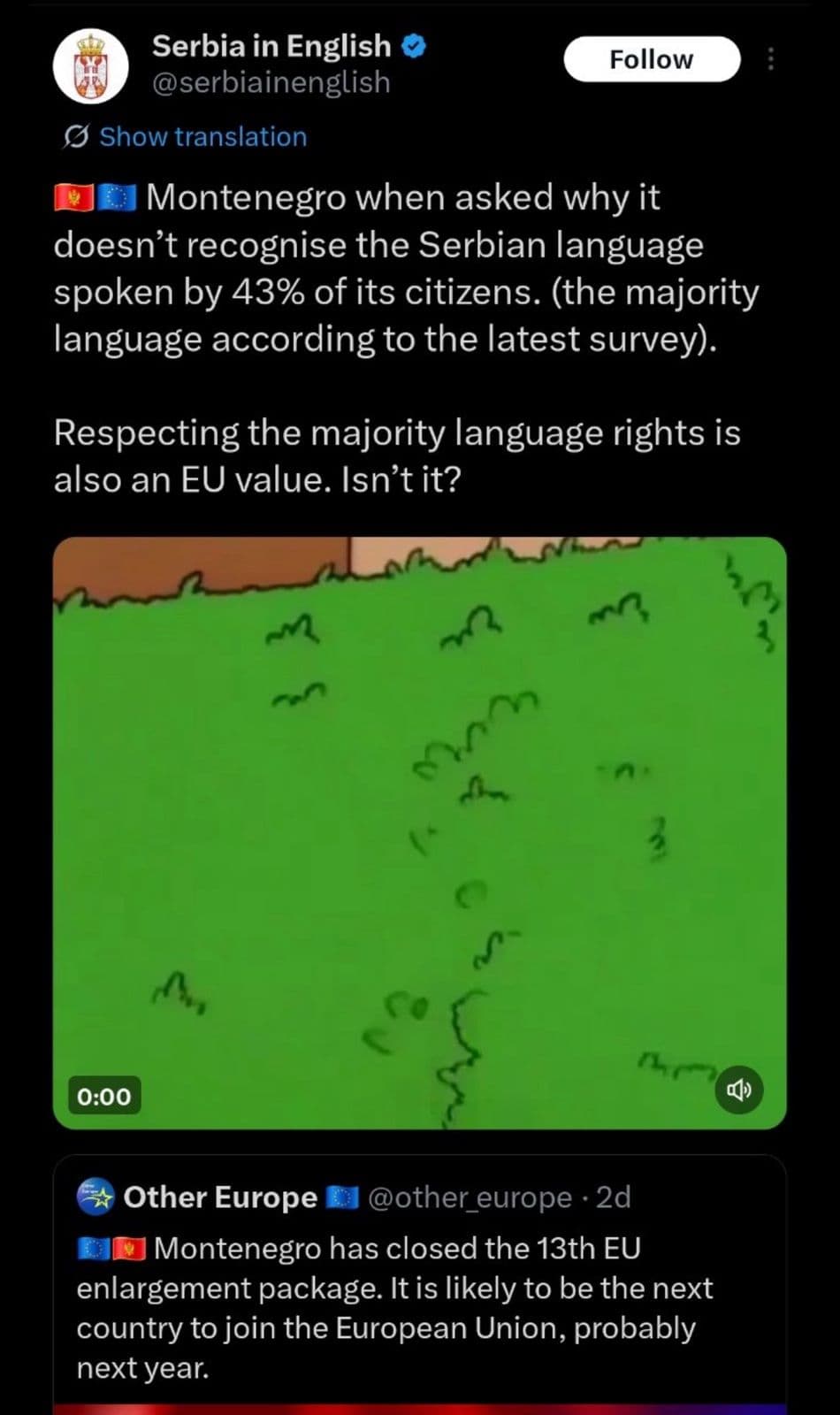 U objavi na mreži X, uz video-snimak na kojem se vidi mim sa Homerom Simpsonom, navodi se da Crna Gora ne priznaje srpski jezik kojim, govori 43 odsto građana, te da je riječ o „jeziku većine prema posljednjem popisu“.
