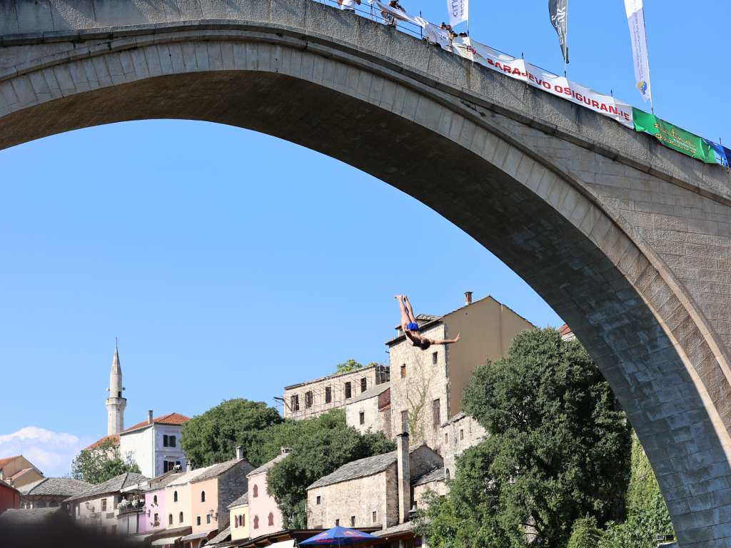 Mlada Mostarka Petra Kožul prije skokova je izvela performans, odnosno ples na svili s luka mosta, priredivši pravi spektakl nad Neretvom.